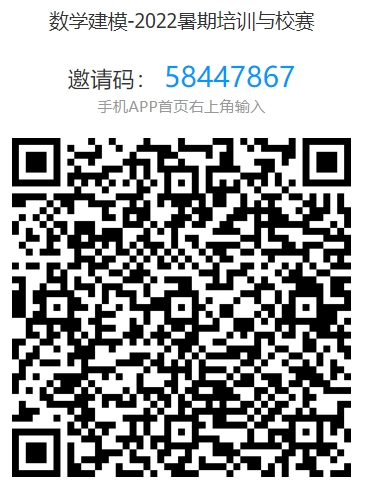 2.报名方式:首先在学习通扫描下图中二维码或输入邀请码加入班级“数学建模-2022暑期培训与校赛”,组队后在学习通班级完成相关信息填报即为报名成功。