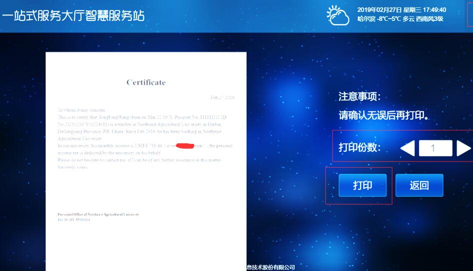 2.出纸口在设备正下方,打印完毕后请及时取走个人证件与材料,谨防遗失,打印完毕后请点击屏幕右上角退出按钮。