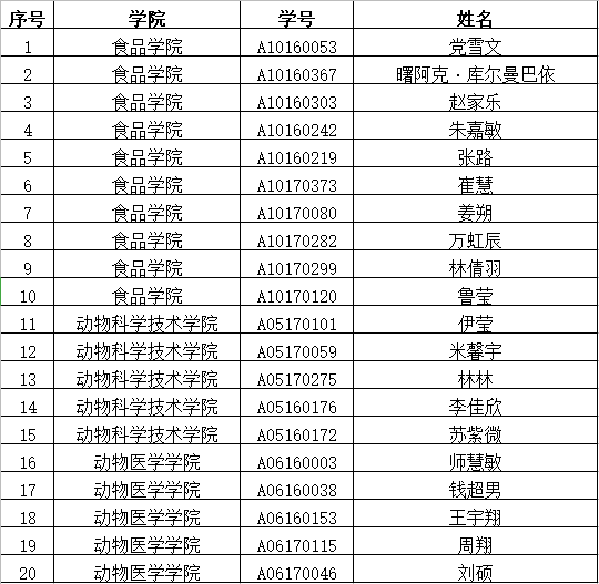 根据东北农业大学《关于评选2018—2019学年度“恒天然奖学金”通知》的相关要求,本着“公开、公平、公正、择优”的原则,在广泛宣传、动员的基础上,经学生本人申请、学院推荐、学校审核,依据评选条件拟定以下20名同学获得东北农业大学2018—2019学年度“恒天然奖学金”,每人奖励4000元,特此公示。名单如下: