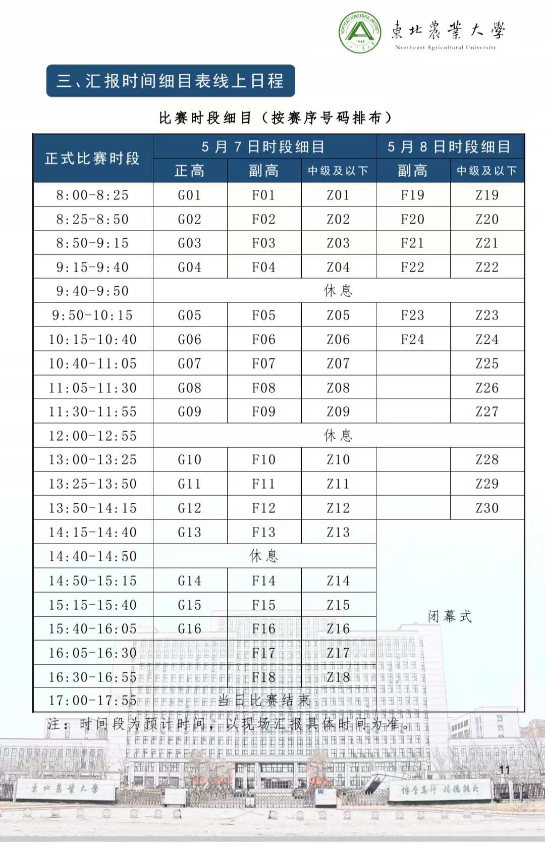 大赛根据主讲教师专业技术职务等级分为正高组、副高组、中级及以下三个组别,参赛教师在各自高校进行线上展示和答辩,展示环节全程网络直播,具体汇报时间见比赛时段细目表。