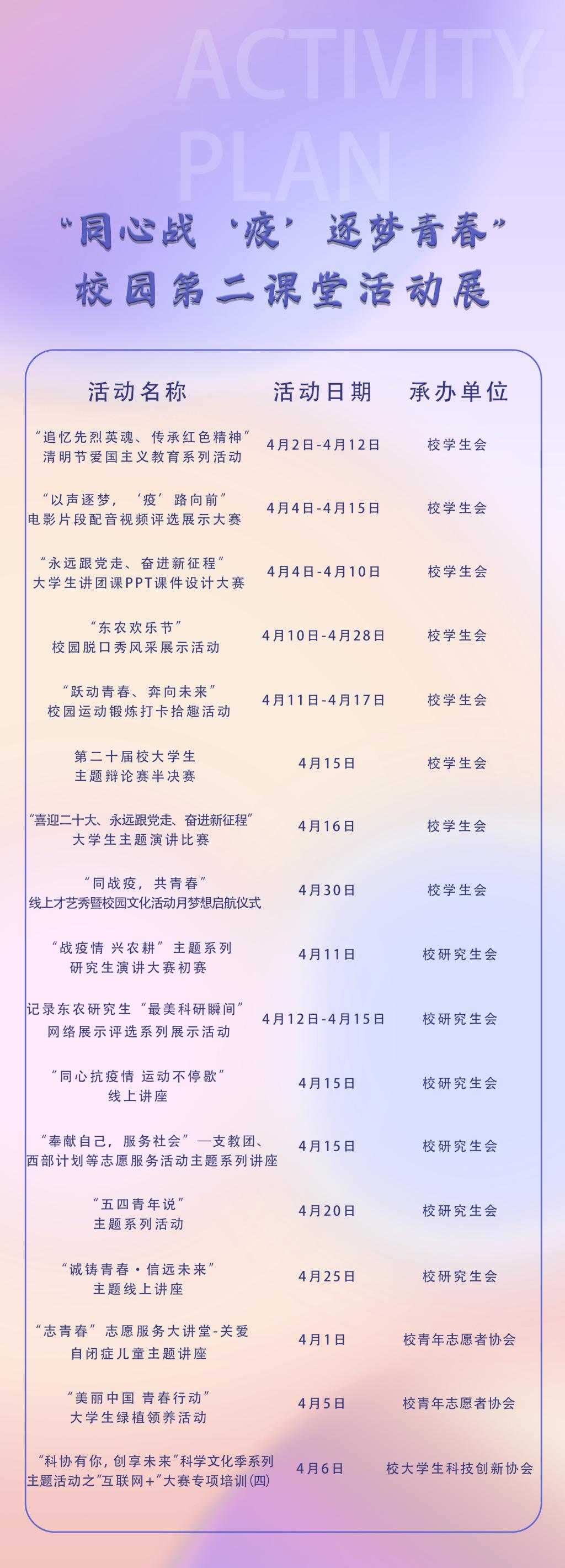 为丰富我校青年学生在校期间课余生活,在严格落实学校关于做好新冠肺炎疫情防控措施的前提下,积极探索防疫期间文化育人新模式,增强同学们战胜疫情的信心和决心,鼓励在校学生封校不封心,校团委决定从本学期开始以月份为单位,推出当月主题系列校园文化活动并公布日历,现将四月份第二课堂活动日历通知如下: