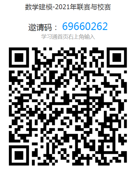 (四)有意参赛同学从即日起请自行组队(每队3名学生,每名学生最多参加一个参赛队参赛,重复加入多个参赛队的以违纪处理,取消今后所有数学建模竞赛的参赛资格并通报批评),并扫描下方二维码加入学习通班级“数学建模-2021年联赛与校赛”,7月20日22:00之前填写报名表进行报名,报名结束后将对参加联赛的报名资格进行审核,并在学习通班级内发布参赛编号。