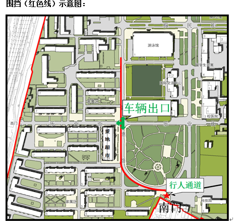 根据哈尔滨市关于应对新型冠状病毒感染肺炎疫情指挥部第12号公告——“对所有社区(住宅小区)、村屯实行封闭管理”要求,为最大限度减少人员流动,防止疫情扩散,经学校研究决定对家属区进行封闭管理。封闭范围为学校南门至家属区17号楼,其中爱地超市北侧乐业街路口为机动车通行通道,南门附近出入口为行人通道(见附图)。请进出车辆及行人严格按照“哈尔滨市关于应对新型冠状病毒感染肺炎疫情指挥部公告”要求,凭出入证“每户家庭每2天指派1名相对固定家庭成员出门采购生活用品,外出时间不得超过2小时”;单位已经复工人员,凭单位开具的证明材料(内容包含:姓名、身份证号码、联系电话、住址、工作单位)和身份证出入。严禁无关人员进入教学区活动。