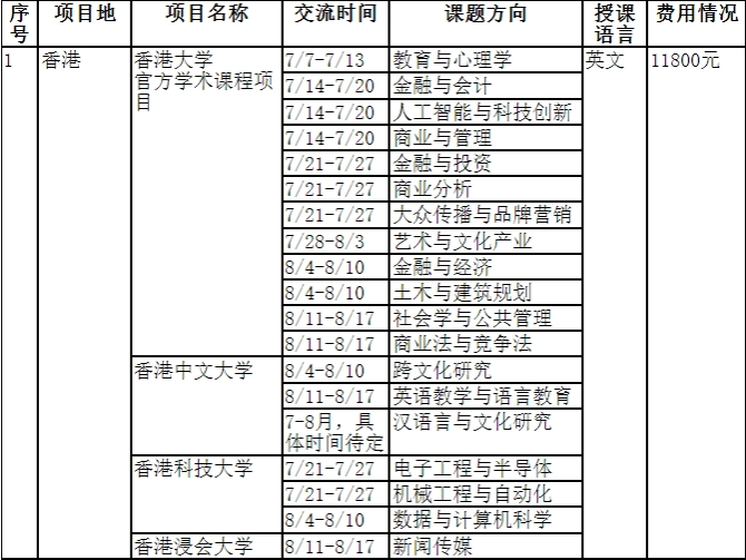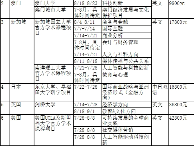 本次暑期交流项目以线下形式进行,交流院校为美国斯坦福大学、加州大学洛杉矶分校、英国剑桥大学、香港大学、香港中文大学、香港科技大学、香港浸会大学、澳门大学、澳门城市大学、日本东京大学、早稻田大学、新加坡国立大学和南洋理工大学,交流领域涵盖理、工、商、传媒、金融,教育等专业,项目报名不限制专业。