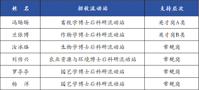 根据《东北农业大学全职博士后支持计划实施办法》(东农人字〔2024〕30号)的有关规定和要求,学校近期开展了2024年第六批全职博士后招收工作,经个人申请、学院遴选推荐、人事处审核,由学校2024年第8次人才工作委员会审议,2024年第20次校长办公会、3届196次校党委常委会审定通过,2024年第六批全职博士后招收共有6人符合进站条件,现将人员名单及支持层次予以公示: