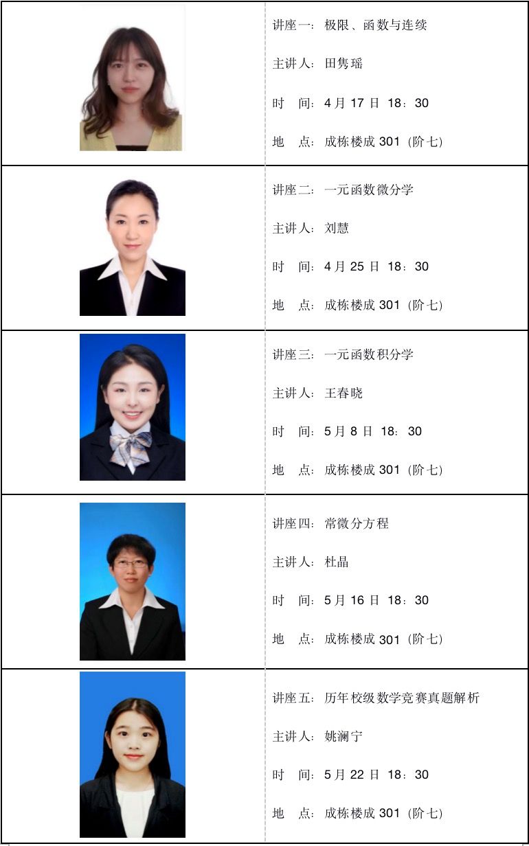 公益讲座全年举行。本学期安排共5次讲座,主要讲解一元微积分和常微分方程部分,并且为5月25日校级数学竞赛提供赛前辅导。下学期将继续开展多元微积分和级数专题讲座,具体安排另行通知。欢迎全校同学踊跃参与,再创佳绩。