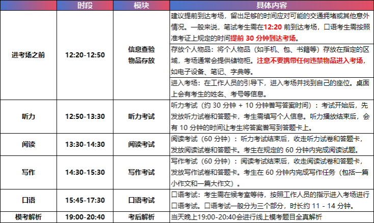 信息查验物品存放:①建议提前到达考场,确保在12:20 前到达考场,口语考生需按照准考证上规定的时间提前30分钟到达考场。②存放个人物品:将个人物品(如手机、包、书籍等)存放在指定的区域,考场通常会提供储物柜。严禁携带任何违禁物品进入考场,如电子设备、笔记、字典等。③进入考场:在工作人员的引导下,进入考场并找到自己的座位。