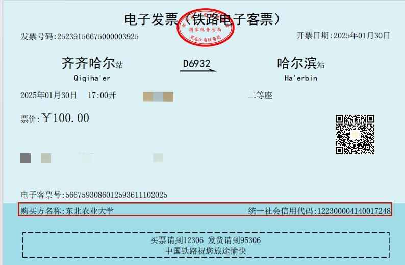 3. 出差人员在铁路12306申请开具电子发票(铁路电子客票)时,务必准确填写发票抬头信息(发票抬头:东北农业大学;纳税人识别号:122300004140017248),否则不予报销。