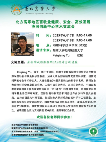 PeiqiangYu,博士,博士生导师,加拿大萨斯喀彻温大学农业与生物资源学院动物与家离科学系教授,加拿大农业部战略研究首席科学家,创新饲料研发专业学术带头人。入选世界前2%最具影响力的科学家名单,获得加拿大动物科学学会卓越研究奖。入选中国农业大学、四川农业大学、中国国家教育部和国家外国专家局联合组织“111计划”特聘国外专家;中国国家自然科学基金外国评审专家。国际创新动物营养和饲养世界会议科学委员会委员,主持多项重大科研項目,包括加拿大联邦政府自然科学与工程基金,加拿大农业和农业食品部基金,加拿大联邦政府创新基金等。发表高质量SCI学术论文320多篇。多次参加国际会议和大学研究所交流并应邀做报告200多次,发表国际会议论文或摘要300多篇,出版著作20多部。
