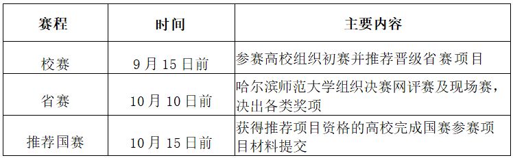 我校会于9月10日前完成对参赛对象及参赛项目的资格审核,对资格审核合格的项目通过国赛系统于9月11日-13日进行网评赛,于9月14日进行线下现场赛,9月15日前完成校赛并对结果进行公示,公示无异议的推荐参加省赛。