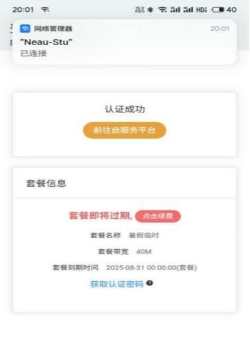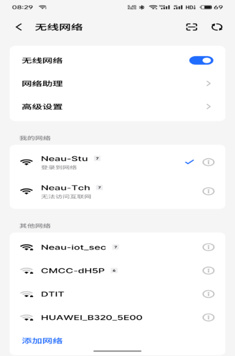2.打开WiFi,选择Neau-Stu连接,教师选择“Neau-Tch”。自动跳转到认证界面,输入学号统一身份认证密码登录即可。