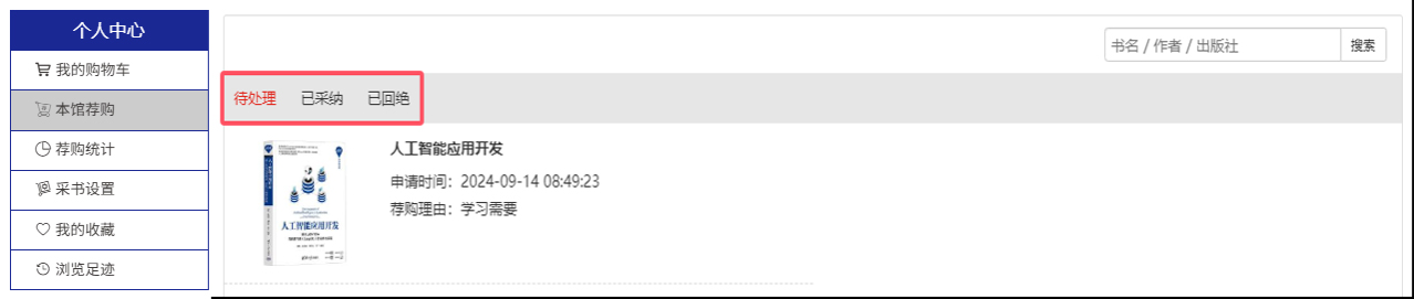 3.我的荐购:【个人中心】→【我的荐购】中可查看到所有的荐购书目,及图书馆的采纳情况。