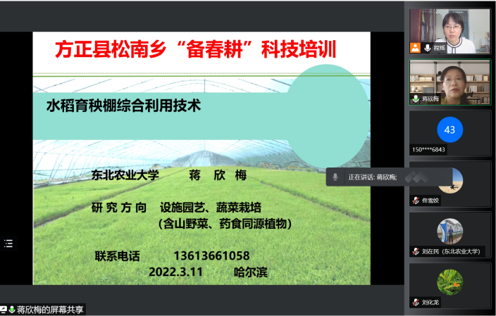 在五常市,我校资环学院姜佰文教授为五常市金禾米业种植基地、阿里郎农业种植合作社及营城子满族乡传授“水稻前氮后移减肥增效技术”和“富硒水稻栽培技术”,并帮助当地开展富硒大米认证,提高水稻产业附加值。在通河县,针对当地种植水稻品种类型多、品种杂、没有当地主载优质水稻品种问题。农学院刘化龙副研究员积极对接当地水稻农民专业合作社开展适宜当地生态环境条件的优质、高产、抗逆性水稻品种筛选实验,经过2年的试验,筛选出“东富177”、“ 唯农214”、“ 唯农211”3个优质品种,解决当地水稻优质米品种急需问题,今年合作社示范种植面积可达2000亩。服务的合作社年加工水稻1.3万吨,年产值2600万元,科技助力当地45户贫困户成为水稻种植能手。在萝北县,丁伟教授围绕东明朝鲜族乡水稻育秧过程中存在的技术问题,进行线上“把脉问诊”,同时为解决秧苗“顶盖”和“培育壮秧、防病的新产品”开出了良方,目前水稻秧苗长势喜人,等待适时插秧。