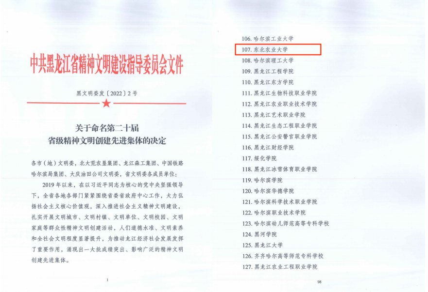 日前,中共黑龙江省精神文明建设指导委员会发布《关于命名第二十届省级精神文明创建先进集体的决定》,我校成功入选第二十届省级精神文明创建先进集体名单,被命名为“省级文明校园标兵”。