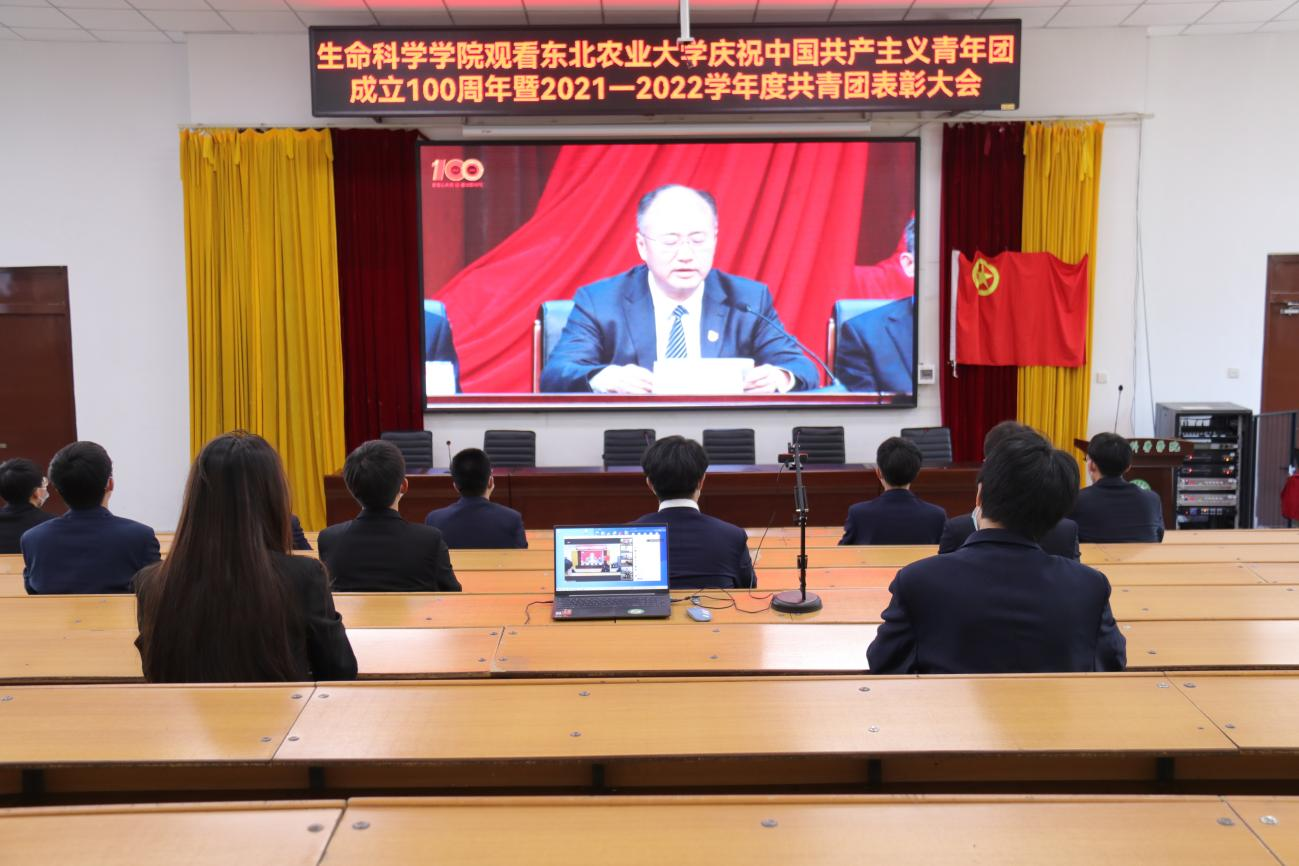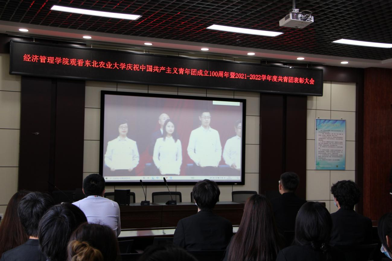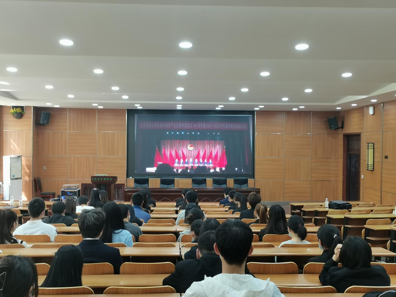 各学院师生代表在分会场观看庆祝中国共产主义青年团成立100周年暨2021-2022学年度共青团五四表彰大会。