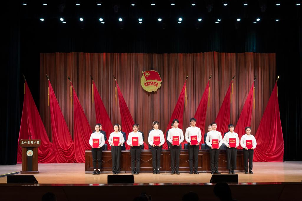 校领导为获得校“优秀共青团干部”“优秀共青团员”的学生代表颁奖