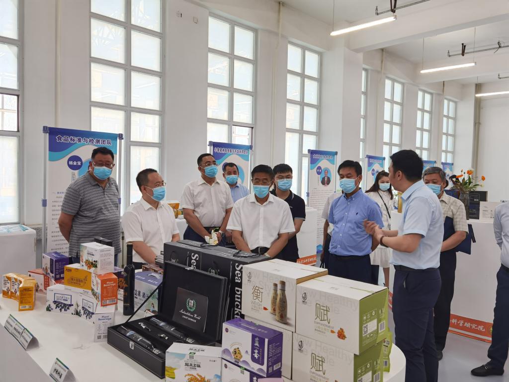 刘兴阁首先深入到江北科技创新大厦一楼科技成果展厅考察调研,听取了杨玉琢关于绿研院围绕“乳、豆、果、副”+“战略规划、检验检测”等领域方向的科学研究及成果转化情况,并参观了绿研院成果转化展厅转化示范产品及相关技术团队的情况介绍,刘兴阁详细问询了展厅中各类产品的合作企业和市场营销收益情况。随后,包联工作组一行参观了农业农村部“大豆传统制品加工技术集成科研基地”,韩建春介绍了大豆中试基地“原料处理、基料制备、产品加工、包装与贮藏、副产物综合利用”等五个模块的工艺创新点和与企业开展中试实验和成果转化的情况。