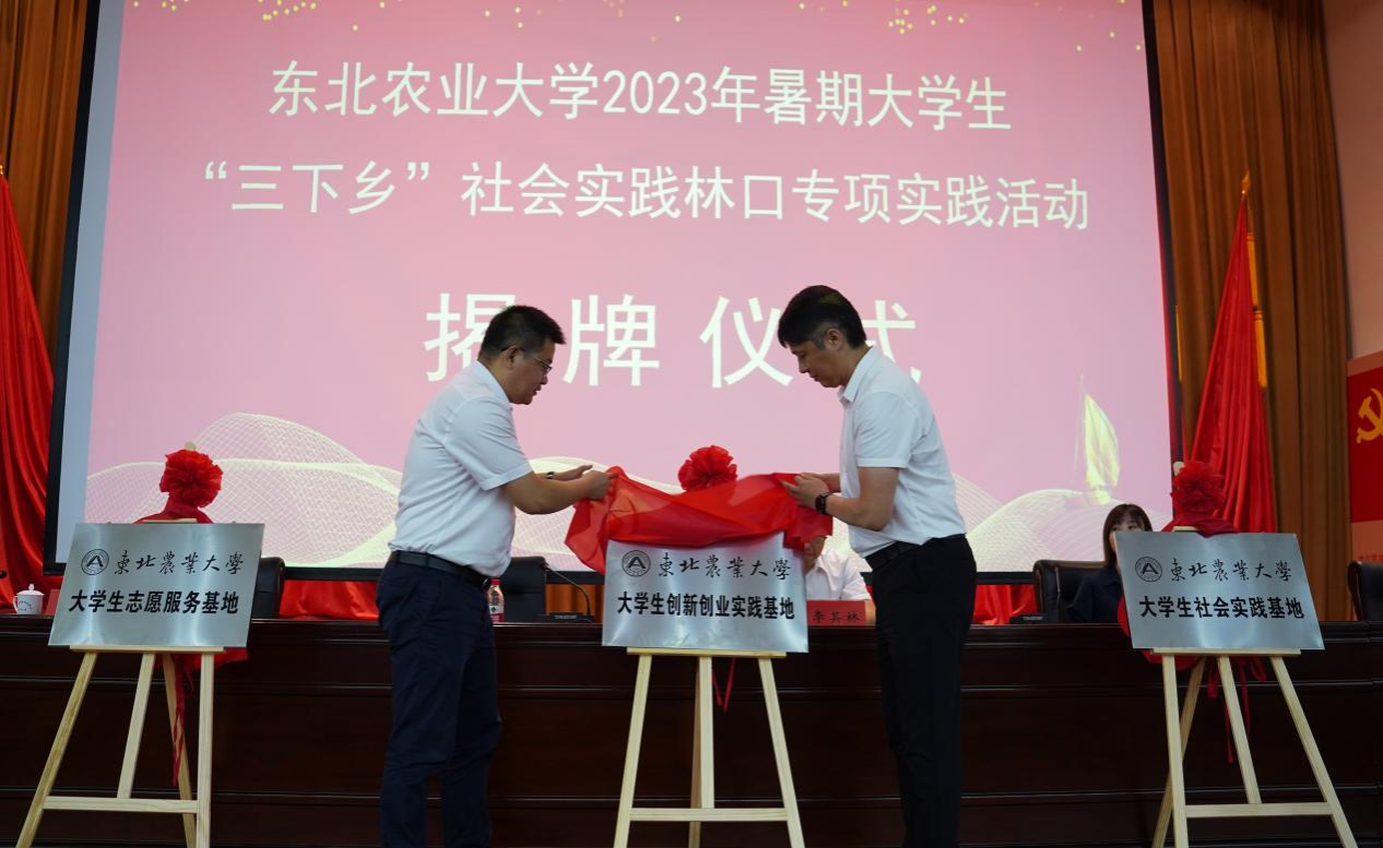 与会领导共同为 2023 年暑期大学生“三下乡”社会实践林口专项实践活动团队代表授旗。李卡和艾磊为大学生创新创业实践基地、大学生社会实践基地、大学生志愿服务基地揭牌。随后,林口县于春芳同志为我校师生作东北抗联专题讲座,以东北抗联精神引领青年传承红色基因,赓续红色血脉。
