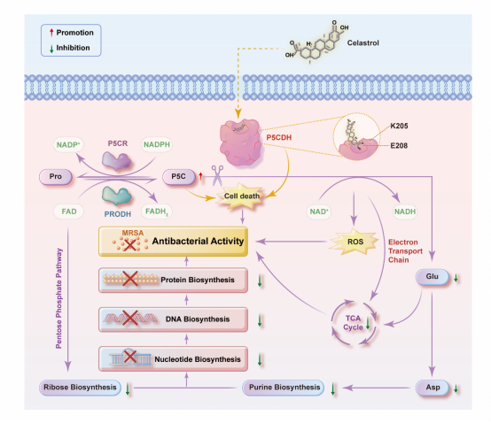 雷公藤红素靶向P5CDH抗耐甲氧西林金黄色葡萄球菌的作用机制示意图
