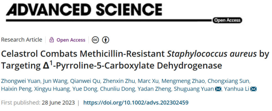 6月28日,我校动物医学学院李艳华教授团队在国际著名学术期刊《Advanced Science》(IF=15.1,中科院一区Top期刊)在线发表了题为《Celastrol Combats Methicillin-ResistantStaphylococcus aureusby Targeting Δ1-Pyrroline-5-Carboxylate Dehydrogenase》的研究论文。我校动物医学学院博士研究生袁中伟为第一作者,李艳华教授和中国科学院深圳先进技术研究院袁曙光研究员为共同通讯作者,我校为第一署名单位。该工作阐明了雷公藤红素靶向Δ1-吡咯啉-5-羧酸脱氢酶(Δ1-Pyrroline-5-Carboxylate Dehydrogenase,P5CDH)抗耐甲氧西林金黄色葡萄球菌(Methicillin-resistantStaphylococcus aureus,MRSA)的作用机制。