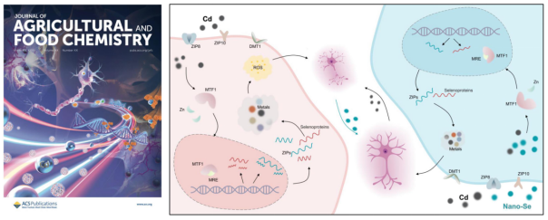 近日,东北农业大学动物医学学院李金龙教授团队在农林科学领域国际权威学术期刊《Journal of Agricultural and Food Chemistry》(IF 6.1,中科院一区TOP期刊)在线发表了题为“Nanoselenium Alleviates Cadmium-Induced Cerebral Injury via Regulating Cerebral Metal Transporters and Metal-Regulatory Transcription Factor 1”的研究性论文,并被遴选为2023年6月刊封面文章(Outside Front Cover)。我校为该文第一署名单位,李金龙教授为通讯作者,博士研究生许雅茹为第一作者。该研究揭示了纳米硒(Nanoselenium,Nano-Se)通过激活MTF1-MTs防御系统,调节金属转运蛋白和金属反应缓解重金属镉(Cadmium,Cd)诱导的脑毒性机制。