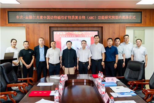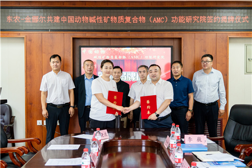李金龙和刘红杰代表合作双方签订《东北农业大学-金娜尔生物中国动物碱性矿物质复合物(AMC)功能研究院》协议书。