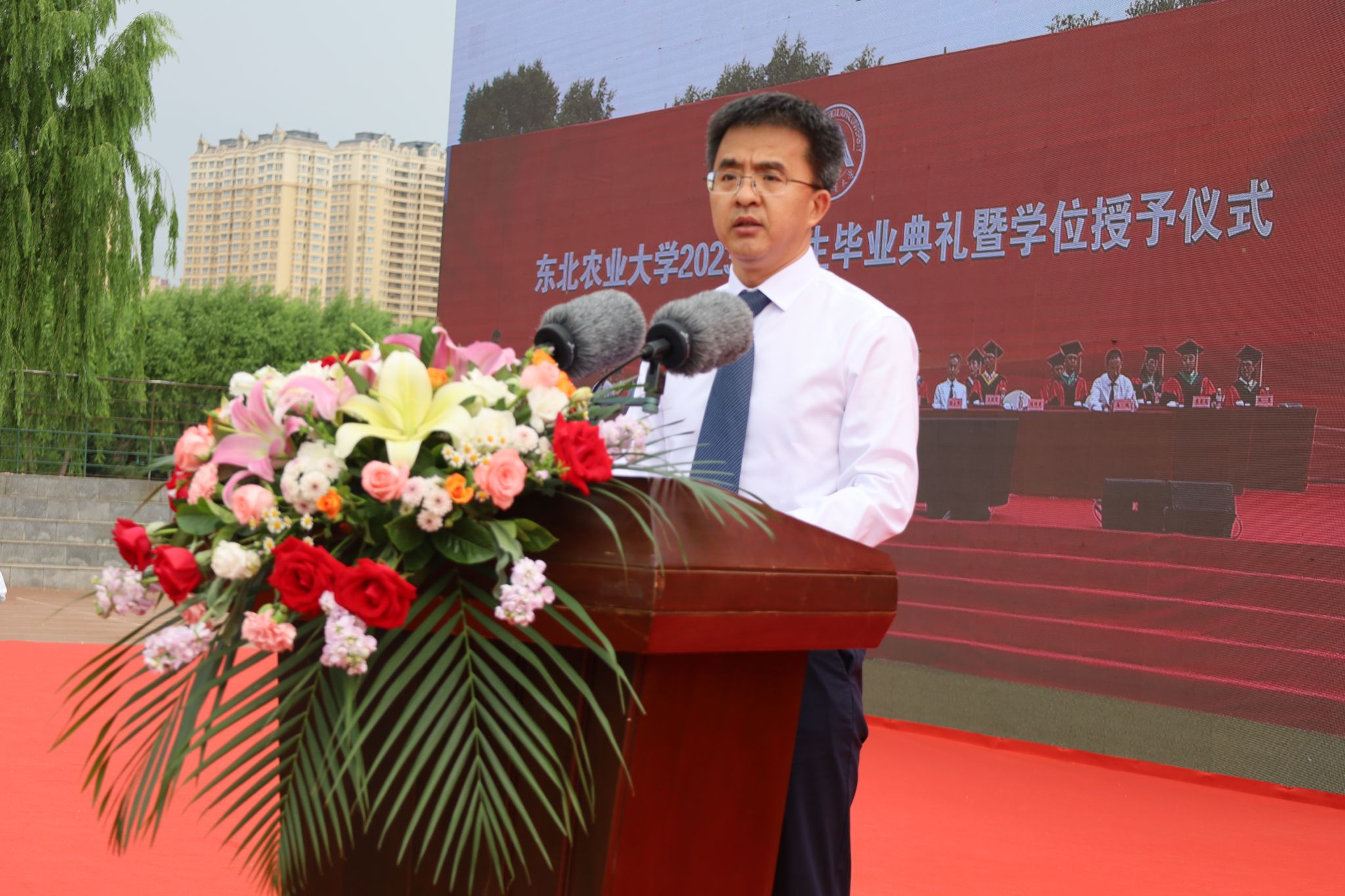 在热烈的掌声中,付强作了题为《坚定东农自信不负时代重托》的讲话。4000余名毕业生代表共同聆听大学时光的“最后一课”。他深情地对毕业生说,“不经历风雨,怎能见彩虹!大自然给2023届毕业生上了最后一课,祝贺全体2023届毕业生以优异的表现给自己、给母校上交了一份满意的答卷!”付强回顾了2023届毕业生与东农同成长、共奋进的难忘时光,并作为校长、师长和学长,给毕业生提出三点希望:一是坚定东农自信,厚植家国情怀,志在星辰大海。胸怀“国之大者”,将个人发展融入国家发展中,为加快实现高水平科技自立自强、扎实推进农业农村现代化建设、不断实现人民对美好生活的向往、全面建设社会主义现代化国家,贡献新时代东农人的智慧和力量。二是坚定东农自信,砥砺强农之志,不负伟大时代。以学识为底蕴,以才气做锋芒,主动担负起建设农业强国、科技强国的历史使命和社会责任,保持锐意进取、永不懈怠的精神状态,争当新时代的实干家、奋斗者、领跑者,在不懈奋斗中展现新时代东农人的新风采。三坚定东农自信,锤炼素质品格,书写绚烂人生。保持终身学习的习惯,持续提升自身的综合素质,在人生的旅途中少一点抱怨,多一些努力和勤奋;少一点自卑,多一些自信和坚强;少想一点自己,多想一些他人,学会“海纳百川”般的包容,学会“壁立千仞”般的刚强,找准人生定位,担当新使命,展现新作为,用奋进之笔谱写新时代东农人的青春之歌。