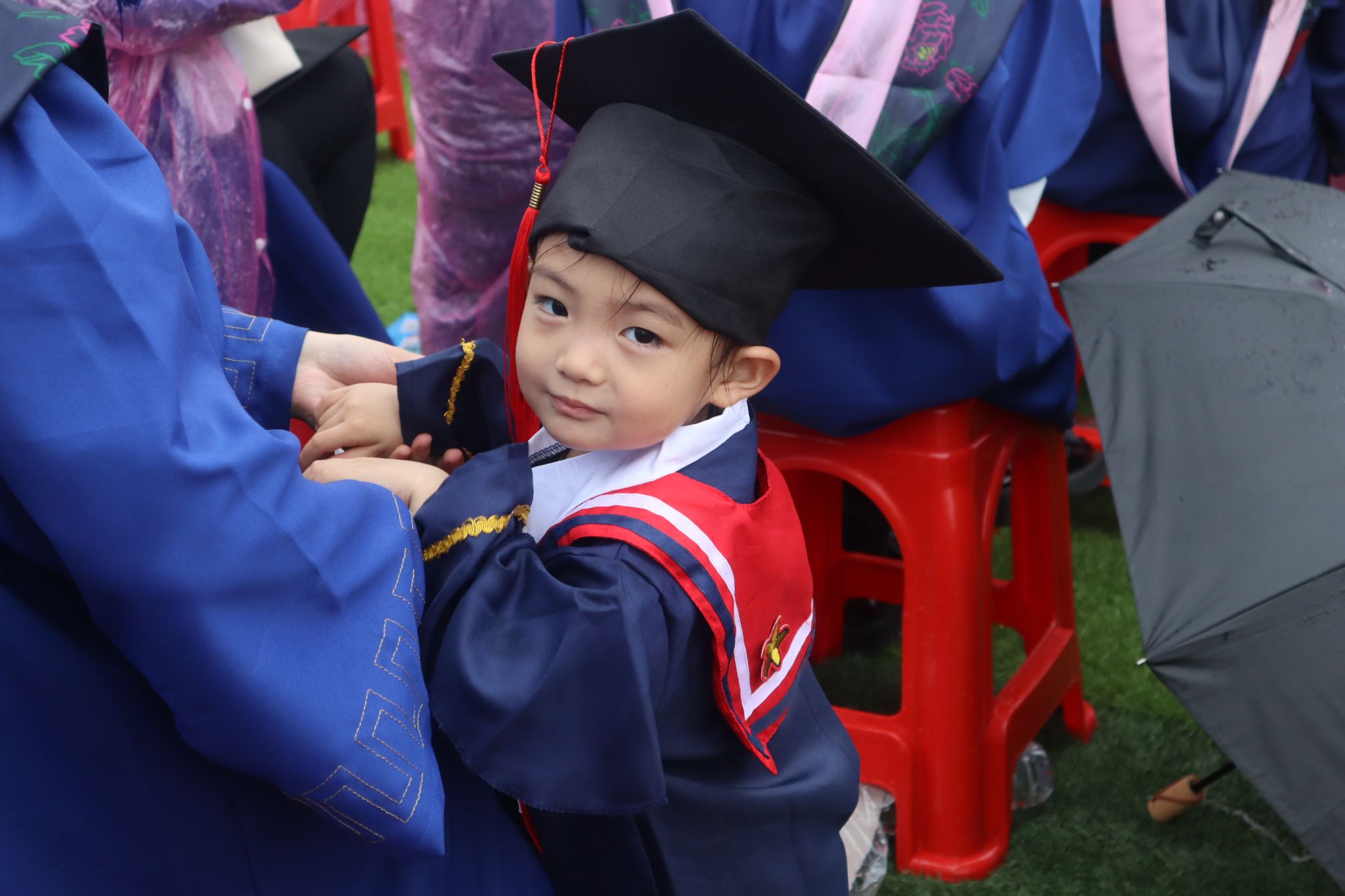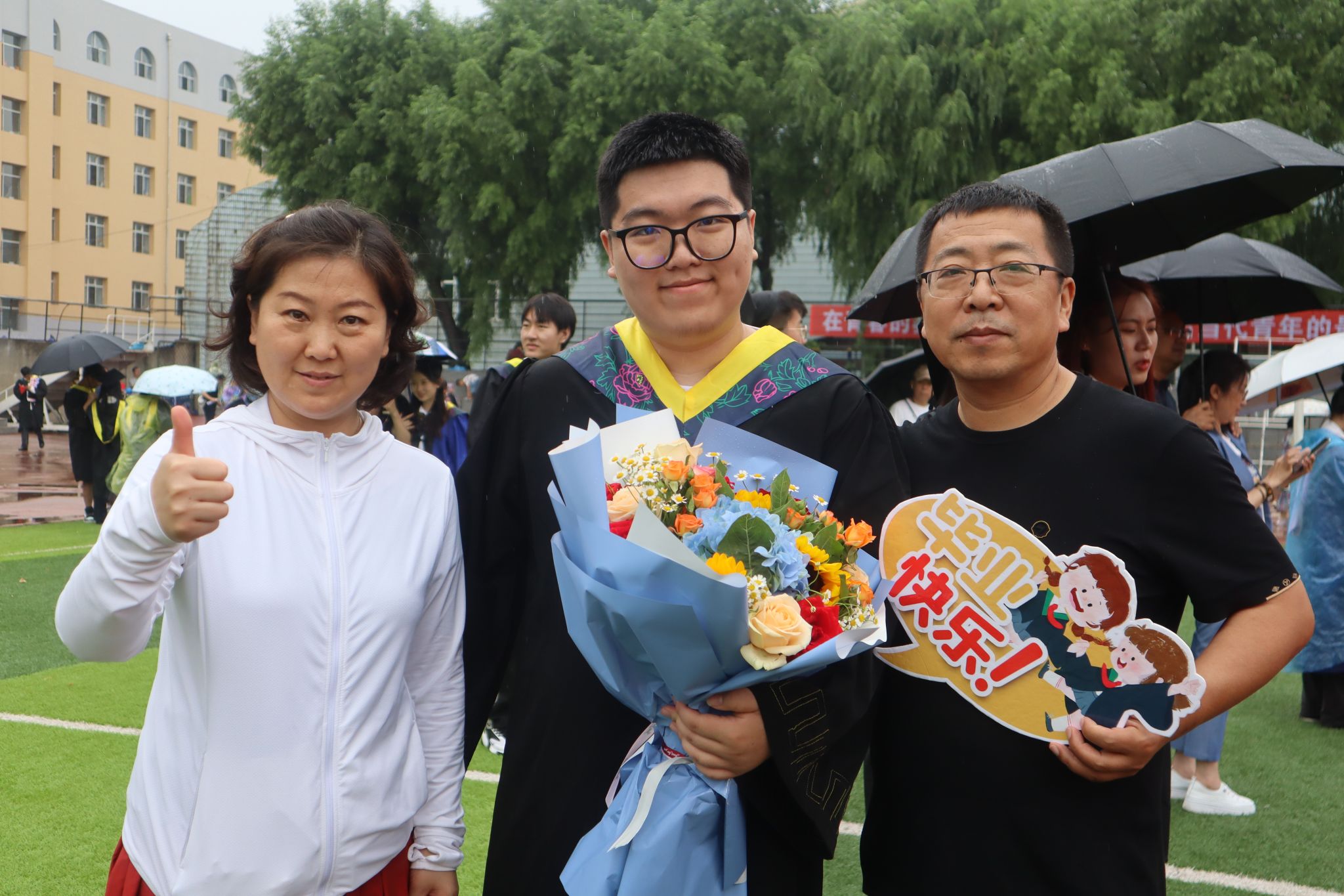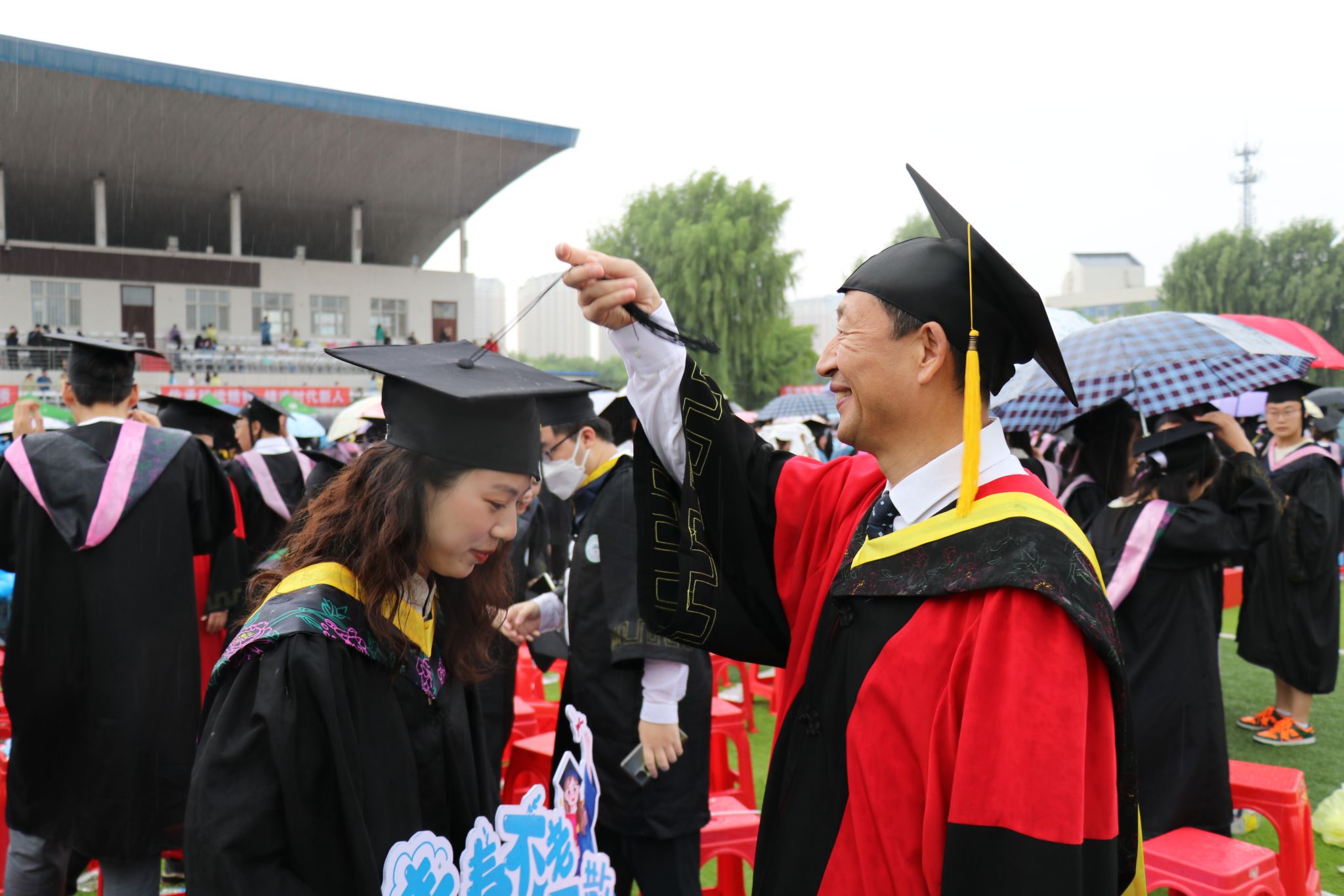 典礼过半,阵雨突如其来,全体参会校领导风雨无阻地为毕业生们送上祝福,同学们穿上学校提前备好的雨衣,全神贯注的聆听、观礼,秩序井然的领奖、发言,展现了毕业生与母校风雨同舟、同心同行的坚定守护与双向奔赴。这场阵雨成为学生毕业前接受的一次特殊“洗礼”,师生共上的一堂特别的毕业大课。