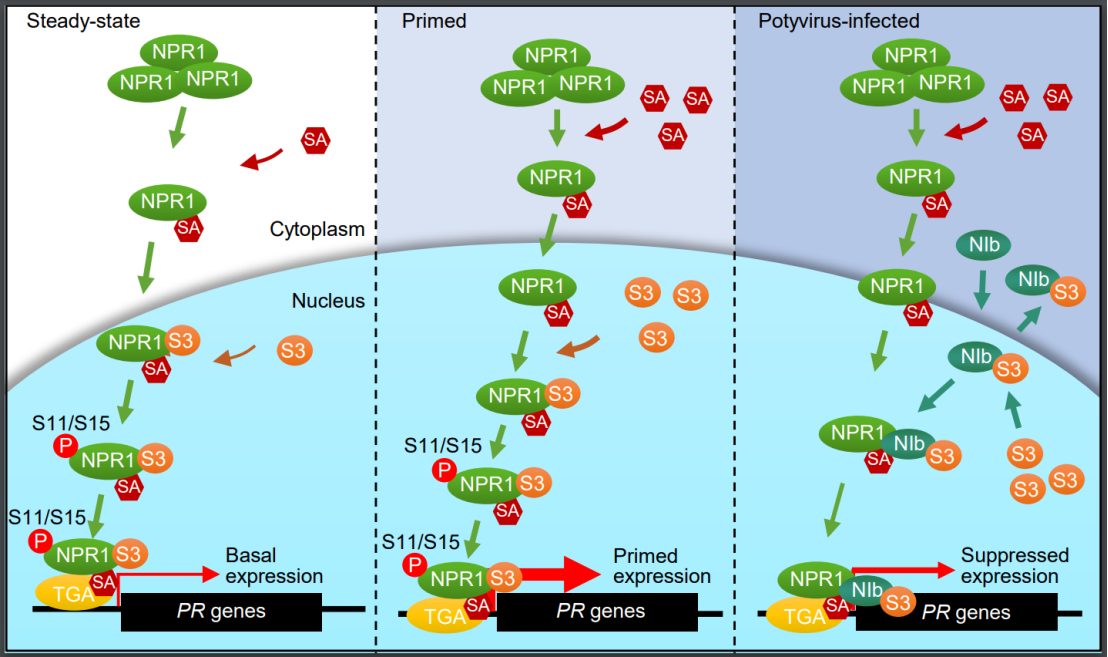 水杨酸信号通路是植物先天免疫的重要组成部分,在维持植物基础抗性和建立系统获得抗性中起重要的作用。2023年6月16日,Nature Communications在线发表了东北农业大学植物保护学院程晓非教授团队题为“A plant RNA virus inhibits NPR1 sumoylation and subverts NPR1-mediated plant immunity”的研究论文。该研究发现水杨酸信号通路在抑制Potyvirus属的芜菁花叶病毒(TuMV)的侵染中具有重要的作用,而TuMV的NIb蛋白能够靶向水杨酸受体NPR1,阻止NPR1与SUMO3的相互作用及修饰,并导致后续苏木化修饰依赖的磷酸化过程不能进行,从而抑制水杨酸介导的植物抗病毒信号通路,以促进病毒的侵染。研究结果揭示了植物与病毒之间的一种新的分子“军备竞赛”,即Potyvirus属病毒利用NIb蛋白破坏NPR1的翻译后修饰,进而抑制水杨酸介导的植物抗病毒反应。