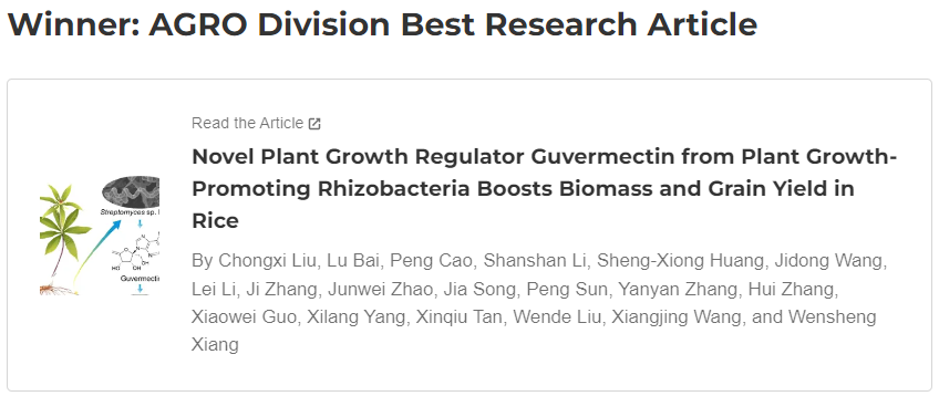 近日,Journal of Agricultural and Food Chemistry (JAFC)、美国化学会农用化学品部(AGRO)及美国化学会农业与食品化学部(AGFD)宣布了2023年Journal of Agricultural and Food Chemistry年度研究文章奖(Research Article of the Year Award)的获奖名单,东北农业大学植物保护学院向文胜教授为通讯作者的《Novel Plant Growth Regulator Guvermectin from Plant Growth-Promoting Rhizobacteria Boosts Biomass and Grain Yield in Rice》文章荣获此奖。