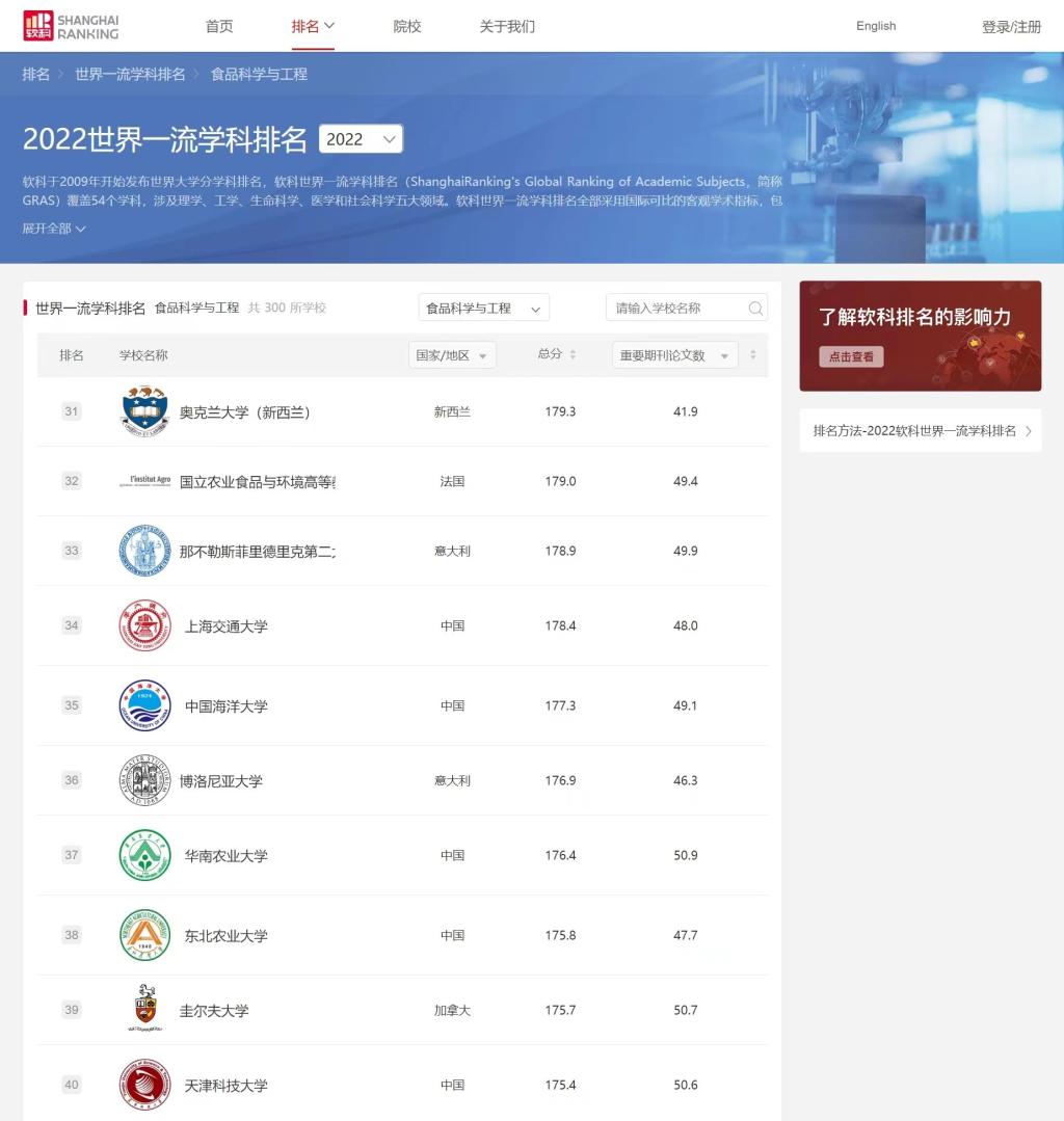 日前,高等教育评价专业机构软科正式发布2022年“软科世界一流学科排名”,我校食品科学与工程学科在世界知名高校中排名第38位。