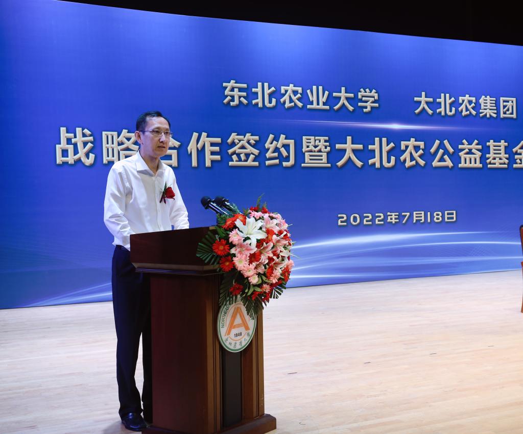李长生代表学校对各位领导、嘉宾的到来表示诚挚的欢迎,对大北农集团和邵根伙博士的慷慨捐赠致以衷心的感谢,对省委省政府和省直各部门、单位一直以来的关心、支持和帮助致以崇高敬意。他指出,本次战略合作协议的签订,是东北农业大学和大北农集团深入贯彻习近平总书记对龙江重要讲话重要指示批示精神的实际行动,是全面落实省第十三次党代会精神的有力举措,是深化校企合作、助力龙江经济发展的使命担当,更是促进双方发展、实现互利共赢的生动实践。他表示,我校将充分用好大北农公益基金捐赠,重点围绕“东北农业大学—大北农集团研究院”建设,聚焦现代种业、健康养殖、食品加工、数字农业等领域,对标生物产业、数字产业等战略新型产业,持续推进数字技术与生物技术相结合,在科技创新、平台建设、成果转化、人才培养和乡村振兴等方面开展全面务实合作,助力大北农早日实现全球第一农业科技企业目标,推动龙江农业实现新突破。
