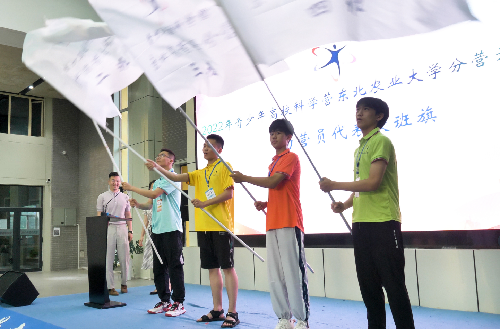 高天琦、吕嘉昌为科学营4个班级授旗,全体营员正式开启为期7天的高校科技体验之旅。