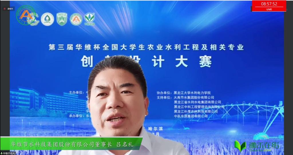 华维节水科技集团股份有限公司董事长吕名礼为本次大赛致辞,他指出农业水利工程高质量发展需要培养面向现代水利产业发展需求的复合型创新型人才,加速智慧农业和智慧水利的发展。衷心祝愿同学们“以赛促学、心怀梦想、两腿粘泥、向下扎根、向上生长”,在中国最好的时代成为最好的力量。