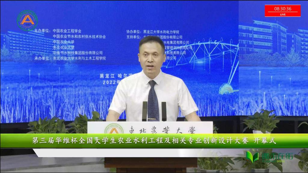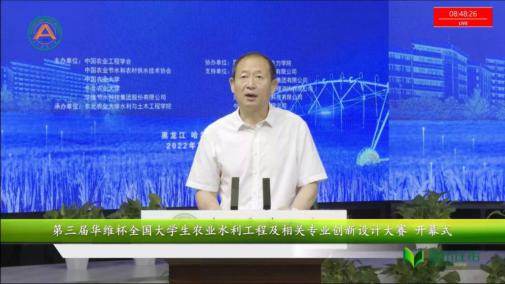 教育部高等学校农业工程类专业教学指导委员会主任、中国农业节水和农村供水技术协会会长康绍忠院士为本次大赛致辞,他高度肯定了本次大赛对大学生实践能力和创新能力培养起到的重要作用,指出农业农村现代化,离不开创新人才的培养,希望同学们能够主动观察,广泛调研,积极思考,勇于挑战,勇于跨学科跨专业协同创新,真正做到学以致用,为我国农业农村事业的发展添砖加瓦。