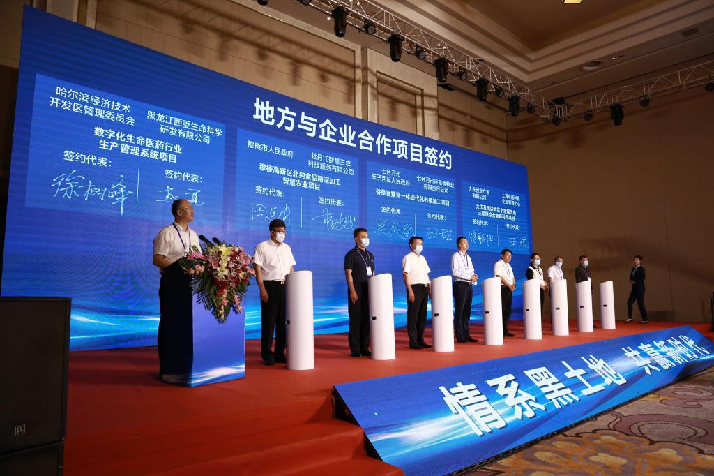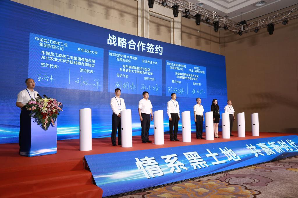 有关部门、企业举行了签约仪式,其中,地方与企业合作项目4个、战略合作项目7个、科技成果转化项目5个,涉及金额6.6亿元。我校副校长邹德堂、孙占峰、刘晓峰作为项目签约人对佳木斯市人民政府-东北农业大学合作共建、东北农业大学-深圳华大基因科技有限公司战略合作、哈尔滨经济技术开发区-东北农业大学战略合作、中国龙江森林工业集团有限公司-东北农业大学企校战略合作、豆类初加工和精深加工技术创新与产品开发合作、特色型东北粳稻品种选育和双河智慧农场建设项目、益生菌产业化技术成果转让、共建佳木斯市国家级数字农业先导区合作、生物菌剂转化合作等9个项目进行现场签约。