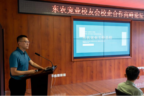 曹继兴做东农宠业校友会工作报告,对学校给予宠业友会的支持和帮助表达感谢,简要回顾了宠业校友会成立以来所做工作及对未来的期望和思考。
