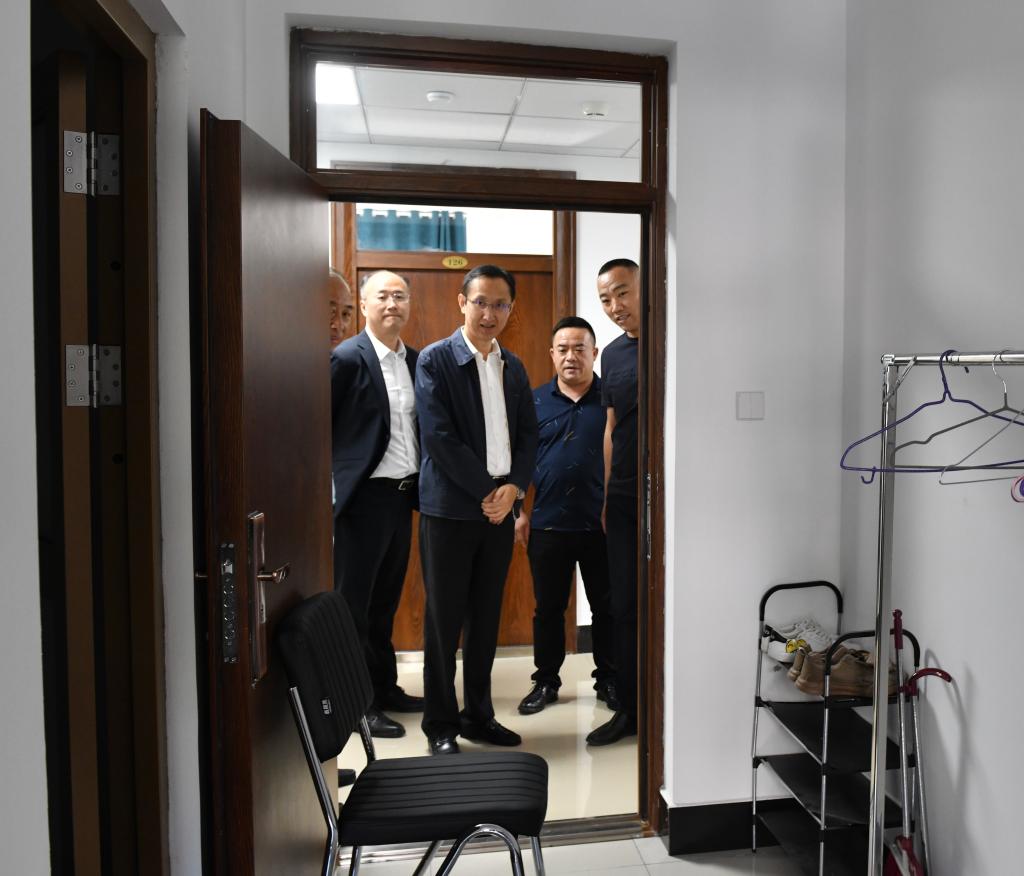 在新建博士生公寓,后勤管理处处长汪志君介绍了迎新公寓准备情况及基建项目、维修项目进展情况。李长生、付强认真查看了工程及家具安装的质量并就后续配套设施安排进行了现场指导,同时代表学校党委和行政向所有一线工作人员及外来务工人员共同参与学校的发展建设所付出的辛勤劳动表示慰问和感谢。李长生、付强表示,博士生公寓建设项目同楼宇维修、道路维修等工程一样,都是时间紧、任务重且师生十分关注的民生项目。暑假期间,后勤管理处的工作人员与外来务工人员始终奋战在工作一线,取得了显著成果。接下来,全体工作人员要再接再厉,进一步在建设、管理和维护上取得新突破。一是强化安全监督。要引导学生树立“人人爱护环境”的良好氛围,提醒学生注意用电、用水安全。二是加强服务管理。要提高对学校博士生群体是学校未来师资储备力量的认识,本着对学校负责、对学生负责的态度,要做好人性化服务管理工作。三是安全文明施工。要严格管理,严格把关,保质保量如期完成各项维修任务,为新学期开学正常的教学、办公、生活提供坚实保障。