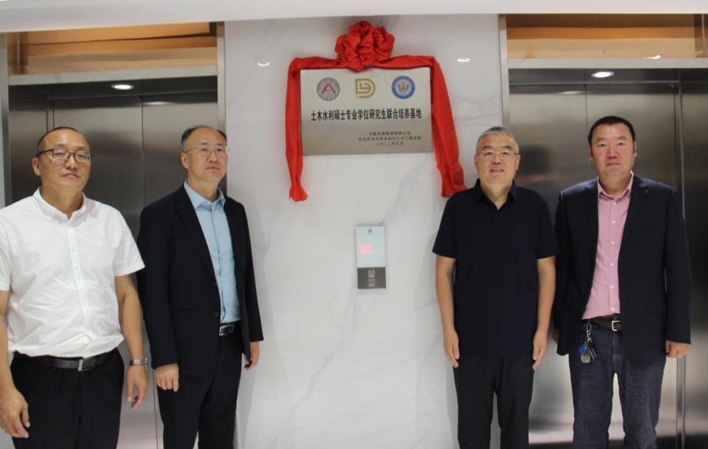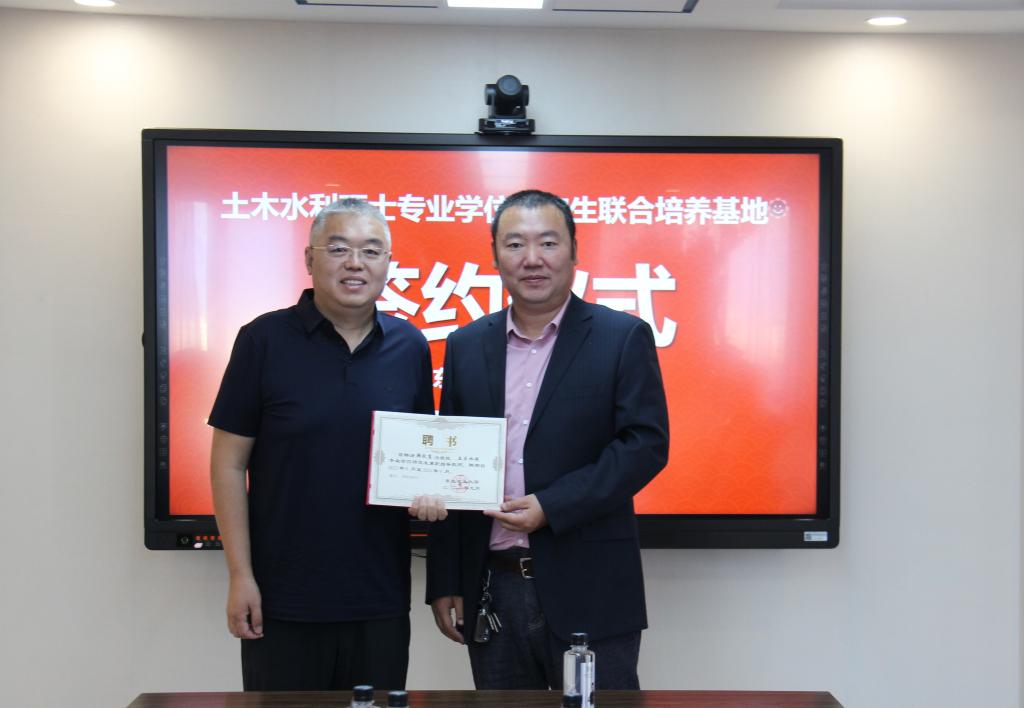 韩跃东、刘东代表双方签订共建“土木水利硕士专业学位研究生联合培养基地”合作协议。韩跃东、付强、王少逸、韩文灏为“土木水利硕士专业学位研究生联合培养基地”揭牌。韩文灏为韩跃东等10位企业专家颁发专业学位研究生校外实践指导教师聘书。