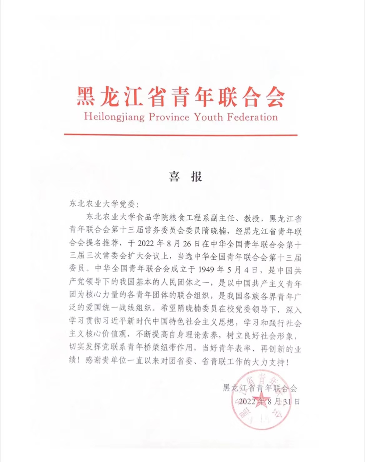8月26日在中华全国青年联合会第十三届三次常委会扩大会议上,我校食品学院粮食工程系副主任、教授、黑龙江省青年联合会第十三届常务委员会委员隋晓楠,当选中华全国青年联合会第十三届委员。