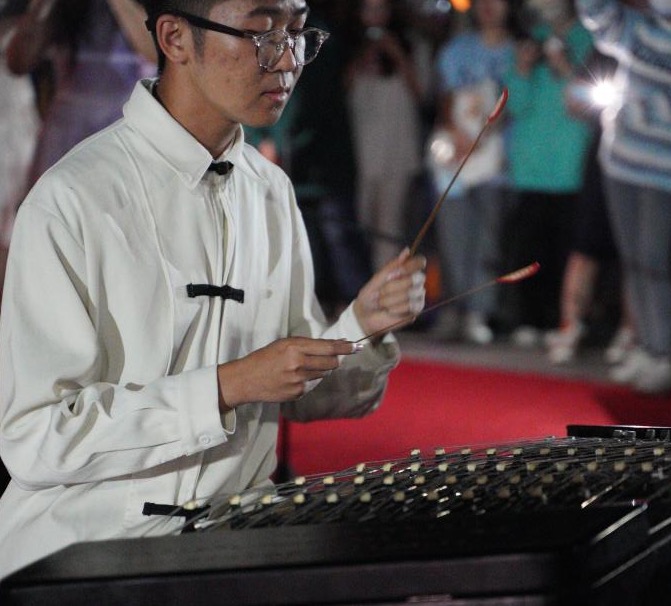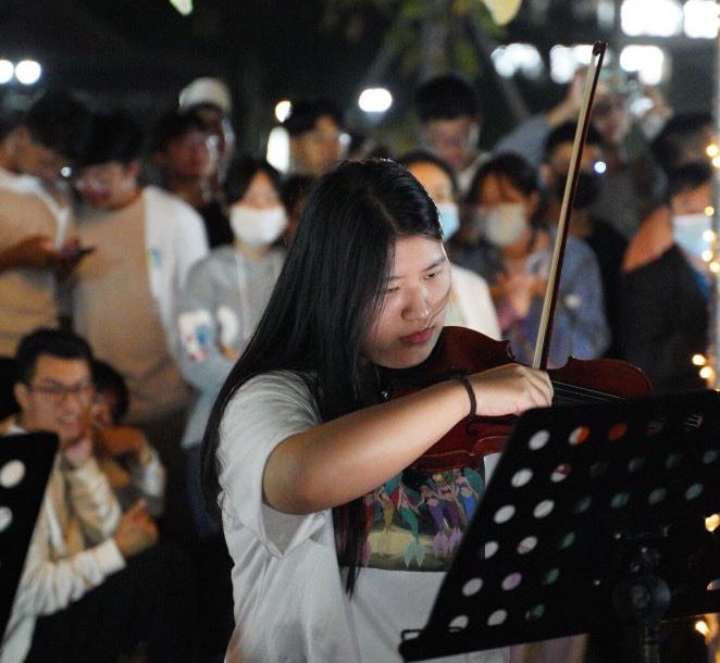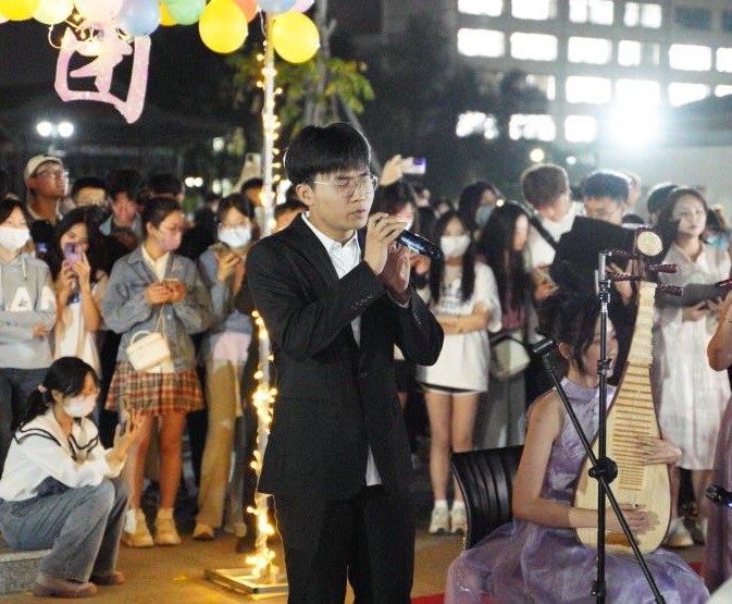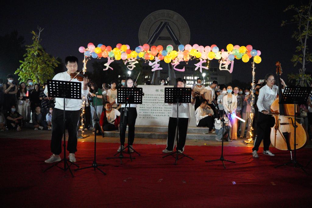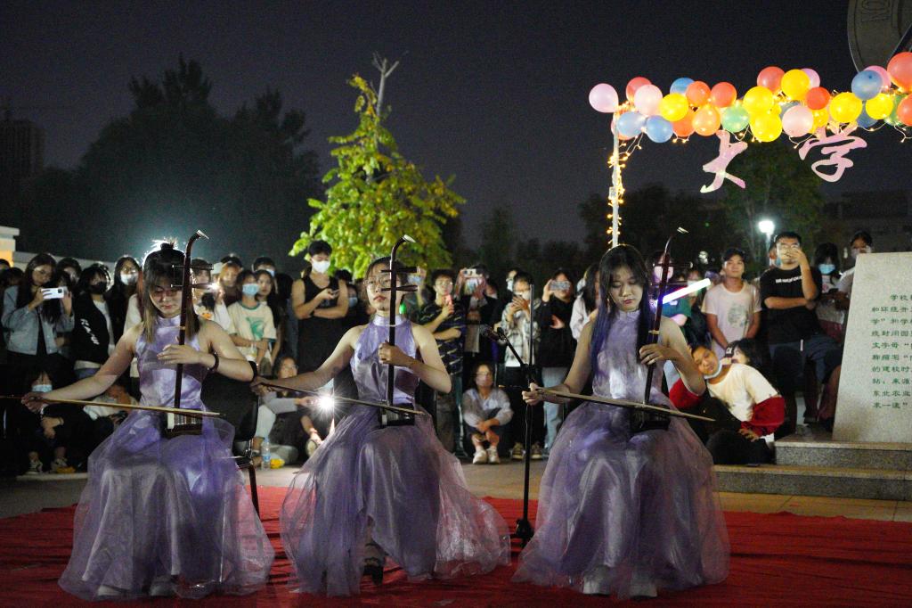 同时,位于主楼北广场的大学生艺术团同步开启“东农高雅文化”文艺演出。演出以大学生乐团民乐合奏《奇迹》开场,古筝、二胡等多种乐器声音相继响起,演奏《卡农三重奏》《兰亭序》等曲目,大学生合唱团演唱《和你一样》《燕归巢》《在夜里跳舞》三首经典曲目,不断为观众带来耳目一新的视听体验,大学生艺术团同学还现场讲解民乐知识,向同学们提供现场体验各类乐器的机会。为后稷园增添了浓厚的节日气息,让东农学子体验一场不一样的中秋盛宴。