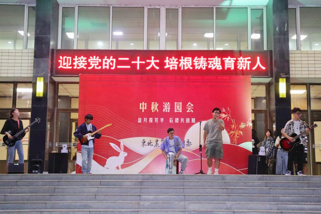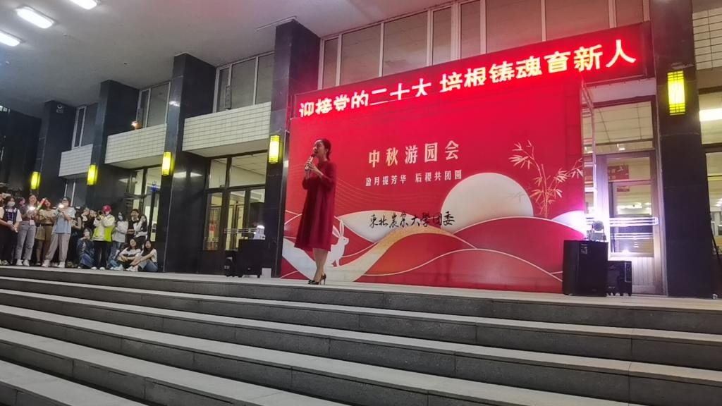 中秋游园会以大学生社团《冰城疫线,幸而有你》大朗诵作为活动开场,朗朗上口,热情激昂,引人注目,第一篇章“东农青春文化”社团演出正式拉开帷幕。音乐协会、吉他协会、AKing舞协、说唱协会、朝阳英语等大学生社团纷纷亮相,表演了《Havana》《红马》《单程票》《落叶归根》等节目,《孤勇者》《告白气球》《夜空中最亮的星》几首脍炙人口的歌曲引起全场学生齐声合唱,M.E.街舞协会带来一段动感的舞蹈《locking Show girl》。大学生社团表演将充满情感色彩的文艺表达、深厚的文化传承与青春时尚动感的文艺演出结合,展现了当代青年学生朝气蓬勃的青春面貌。特别是作为特邀嘉宾的大北农集团企业文化顾问陈丽如登台为同学们演唱《好日子》,现场观众情绪高涨,活动氛围也随之达到高潮。