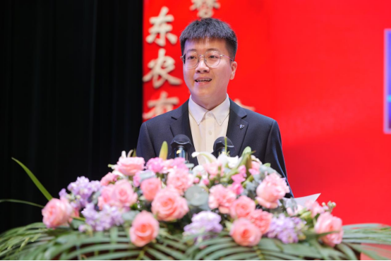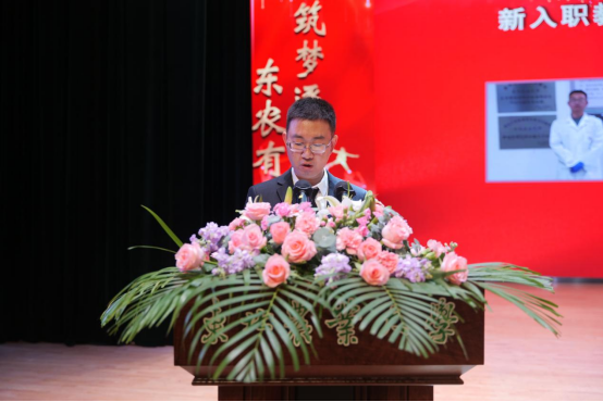 园艺园林学院王沛文代表新入职教师发言。他为能够加入拥有优良革命传统和深厚文化底蕴的东农感到骄傲与自豪,也深刻体会到了这份荣誉的背后肩负的责任与义务。他表示,要认真巩固并不断完善专业知识体系,积极向前辈学习,提高自身业务水平,将“艰苦奋斗,自强不息”的优良传统继续传承。