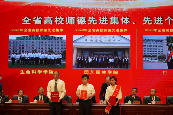 会上,校领导为“2021年全省高校师德先进集体”生命科学学院,“2020年全省高校师德先进集体”园艺园林学院,“2020年全省高校师德先进个人”付颖进行颁奖。