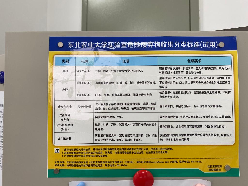 在实验室管理处和保卫处的支持下,学院管理条例和注意事项全部更换成新的内容。结合学院实际情况,重新制定了易制毒药品的管理规定,更新了汇编内容,并在实验室走廊、电梯口等醒目位置,张贴了实验室安全管理规定。在制度上保证了及时更新,在设备上也做足了提示,学院所有实验室均配备了危险废弃物垃圾桶和废弃液处理桶,气瓶有功能架和状态牌,高温高压仪特种设备有警示标识,并配有灭火器。危险药品柜实行双人双锁管理,严格领用制度,用后马上归还。这些都是学院“百日行动”开展以来看得见的成效。