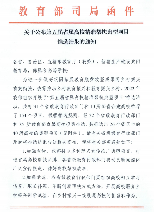 据悉,教育部开展“第五届省属高校精准帮扶典型项目”推选旨在进一步做好巩固拓展教育脱贫攻坚成果同乡村振兴有效衔接,统筹推动乡村教育振兴与教育振兴乡村,经32个省级教育行政部门与75所教育部直属高校投票推选,共确定了40所高校典型项目,我校精准帮扶黑龙江省甘南县典型案例位列其中,并获得专项经费支持进行深化拓展和示范推广。