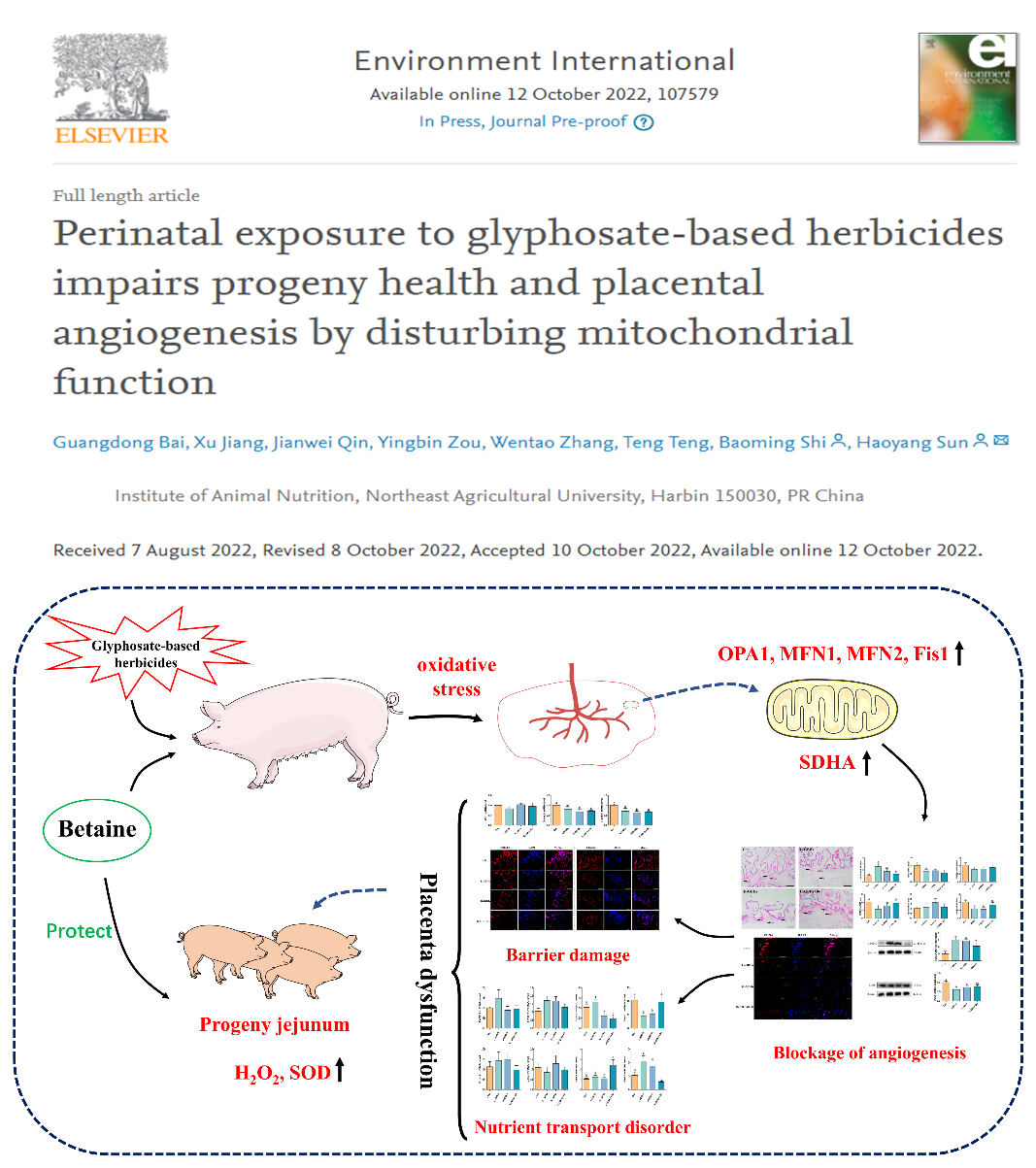 近日,我校动物科学技术学院石宝明教授团队在国际环境和健康领域顶级期刊《Environment International》(IF=13.352,中科院一区Top期刊)在线发表了题为《Perinatal exposure to glyphosate-based herbicides impairs progeny health and placental angiogenesis by disturbing mitochondrial function》的研究论文。我校为该文唯一署名单位,石宝明教授和孙浩洋讲师为通讯作者,博士研究生白广栋为第一作者。这是我校在《Environment International》期刊上首次以第一单位发表论文,取得了突破性创新。该项研究得到了国家自然科学基金和黑龙江省杰出青年基金的资助支持。