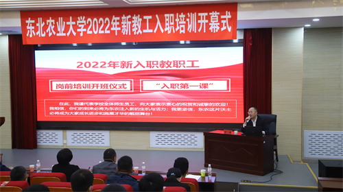 为使新入职教工坚定立德树人的信念,深入理解学校的历史、文化、办学理念,熟悉学校相关的文件、政策和规章制度,掌握基本的教学技能和教学工作规范,尽快实现角色转变,更快、更好地适应我校教师岗位需求,10月24日上午,东北农业大学2022年新教工入职培训开班式在我校国际交流中心101会议室举行。校长付强,副校长李伟凯、刘竹青,组织部部长于雷、人事处处长吴立全、教务处处长张永强、教务处副处长马海鹍、教师发展中心主任李芳和102名新入职教职工参加开班式。开班式由张永强主持。