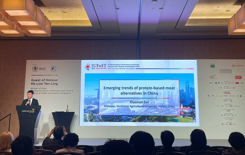 会议期间,国际食品科学技术联盟宣布,经中国食品科学技术学会提名推荐,世界各国联盟成员专家评审,东北农业大学隋晓楠教授荣获2022-2023年度国际食品科学技术联盟“青年科学家奖”(IUFoST Young Scientist Award),以表彰其在大豆蛋白质结构的基础研究和功能特性的应用开发研究方面取得的卓越成果。此次获奖充分体现了国际食品科技界对我国青年科学家的优秀素质与杰出成就的肯定与赞誉。隋晓楠教授作为本届会议来自中国高校的唯一获奖者,受邀作大会主题报告(Plenary Talk),与全球食品领域学者分享我国植物基肉制品的研发现状发展趋势。