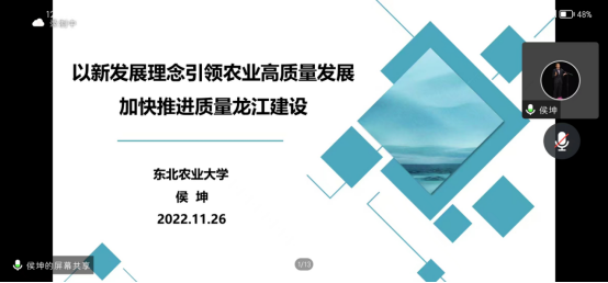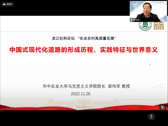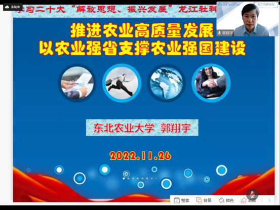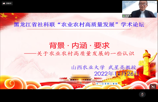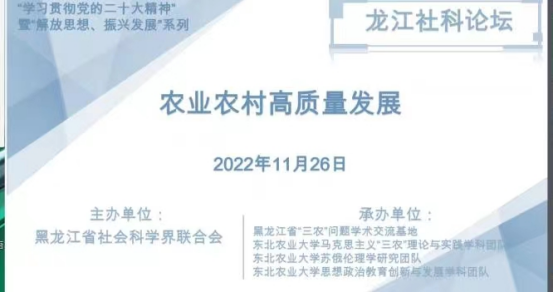 为深入学习党的二十大精神,进一步深化对习近平总书记关于“三农”工作的重要论述的研究、阐释与践行,凝聚起广大“三农”研究工作者奋斗新时代、奋进新征程的磅礴力量,营造学习宣传贯彻党的二十大精神的浓厚氛围,11月26日,黑龙江省“三农”问题学术交流基地通过视频会议形式举办了“农业农村高质量发展”学术论坛。本次学术论坛由黑龙江省社会科学界联合会主办,黑龙江省“三农”问题学术交流基地、我校马克思主义“三农”理论与实践学科团队、苏俄伦理学研究团队、思想政治教育创新与发展学科团队共同承办。黑龙江省社会科学界联合会学会部部长、一级调研员马琳,学会部副部长、二级调研员黄琦全程参会指导。来自华中农业大学、河北农业大学、山西农业大学、云南农业大学的专家代表,以及我校现代农业发展研究中心、经济管理学院、公共管理与法学院、马克思主义学院师生140余人全程参与了本次论坛。本次学术论坛是龙江社科论坛“学习贯彻党的二十大精神”系列论坛的专场活动之一,本次专场的主题是“农业农村高质量发展”。我校党委副书记兼工会主席庞玉红致辞。论坛召集人、黑龙江省“三农”问题学术交流基地主任、马克思主义学院副院长赵继颖主持论坛并作总结。